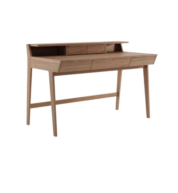 A raised shelf with three small drawers keeps stationery and essentials neatly stored, while three spacious lower drawers with groove handles provide ample storage for documents and supplies. The desk’s sturdy build and ergonomic height ensure comfort whether you’re working or studying.