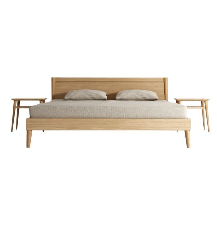 The frame includes stable wooden slats for excellent mattress support, removing the need for a box spring. Matching teak nightstands complete the look, giving your room a cohesive Scandinavian-inspired charm.